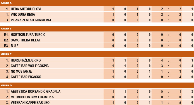 U jedinom današnjem veteranskom susretu dana Veterani Caffe bar Wolf Gospić nadigrali su NK Mostanje rezultatom 3:1 i plasirali se u finale skupine. Riječ je o susretu skupine C, koja jedina ima četiri ekipe, pa se u njoj igra sustavom da pobjednici prvih utakmica igraju za prvo, a poraženi za treće mjesto skupine. Tako će se za pobjednika skupine boriti Hidris inženjering i Veterani Caffe bar Wolf Gospić, a za treće mjesto NK Mostanje i Caffe bar Picasso.