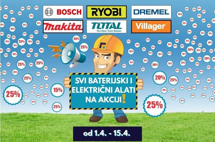 Riječ je o akciji profesionalnih alata s popustima do 25%, koja traje svega 15 dana što je čini jednom od najatraktivnijih ponuda ove sezone. U ponudi su vrhunski alati poznatih brendova: Bosch, Makita, Ryobi, Villager, Dremel i Total Tools.
