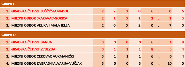 Ekipa Gradske četvrti Luščić-Jamadol pobijedila je u skupini C, a ekipa Gradske četvrti Banija u skupini D.