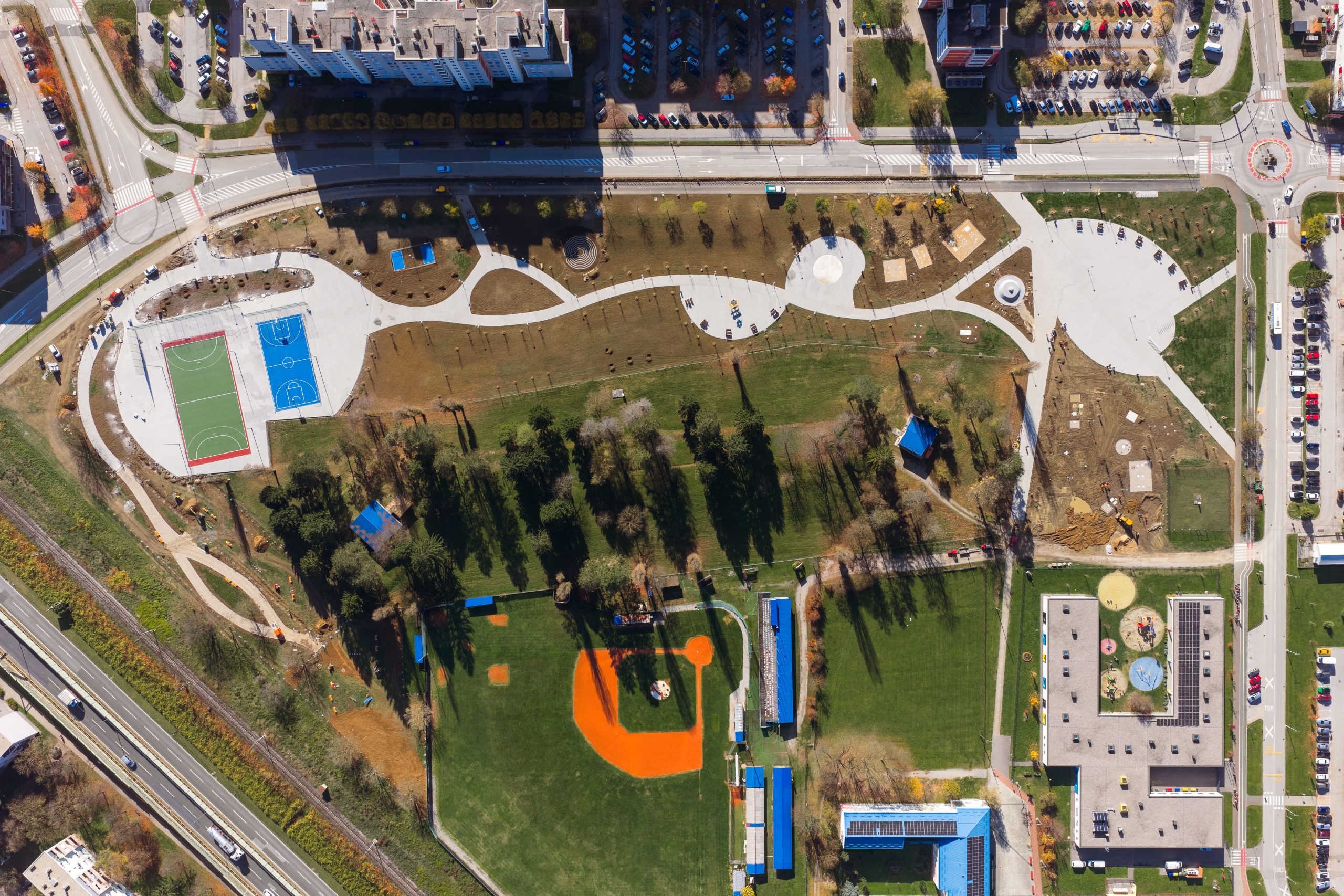 U njemu su već izgrađene pješačko-biciklističke staze, postavljena ili će biti javna rasvjeta, urbana oprema, klupe sa stolovima i samostalne, uređena igrališta za košarku i nogomet, postavljeno pametno drvo – sa šesterokrakom karlovačkom zvijezdom na vrhu! – tri pametne klupe, dvije servisne stanice za bicikle na solarni pogon…