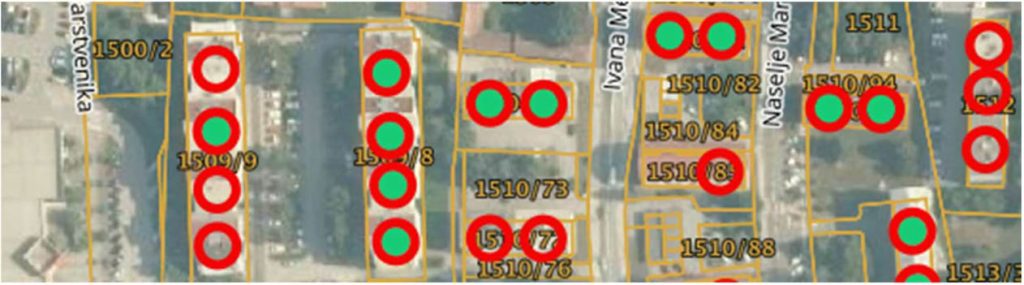 Crveni kružić = znači da je zgrada upisana samo u RUZ i nema OIB