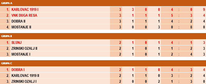 skupina A: Karlovac 1919 I – VNK Duga Resa 2:0, Dobra II – Mostanje II 3:0, VNK Duga Resa – Mostanje II 4:0, Karlovac 1919 I – Dobra II 1:0, Dobra II – VNK Duga Resa 1:1, Mostanje II – Karlovac 1919 I 0:1