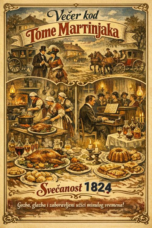 Večer se polako spušta nad selo, a godina je 1824. U kući uglednog pekara i trgovca Tome Martinjaka vlada neuobičajena živost. Kamenitim putem pred kuću pristižu gosti u kočijama, uglednici toga vremena, odjeveni prema tadašnjim pravilima visokog društva. U prostorijama obasjanim toplim svjetlom petrolejki i kristalnih lustera, uz zvuke klavira i violine, stvara se ugođaj nekadašnjih gospodskih večeri.