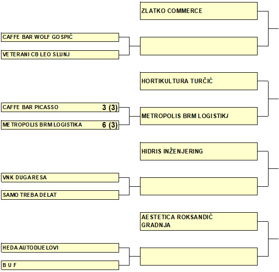 Veterani natjecanje nastavljaju prema niže prikazanom sustavu, a posljednja utakmica današnjeg dana bila je razigravanje za plasman u četvrtfinale između Caffe bara Picasso i Metropolisa BRM Logistike. ‘Ugostitelji’ su odlično odigrali prvo poluvrijeme, poveli su 3:0, a suparnik je do poluvremena smanjio na 3:1. U nastavku je Metropolis BRM Logistika preuzela inicijativu, smanjila na 3:2, Caffe bar Picasso zatresao je vratnicu, a Metropolis je tri minute i 20 sekundi prije kraja povukao vratara iz igre, vrlo brzo poravnao na 3:3 i odveo dvoboj u raspucavanje deveteraca. Igrači Caffe bara Picasso nisu uspjeli pogoditi niti jedan od prva tri deveterca, dok su igrači Metropolis BRM Logistike bili precizni i konačnim rezultatom 6:3 se plasirali u četvrtfinale.