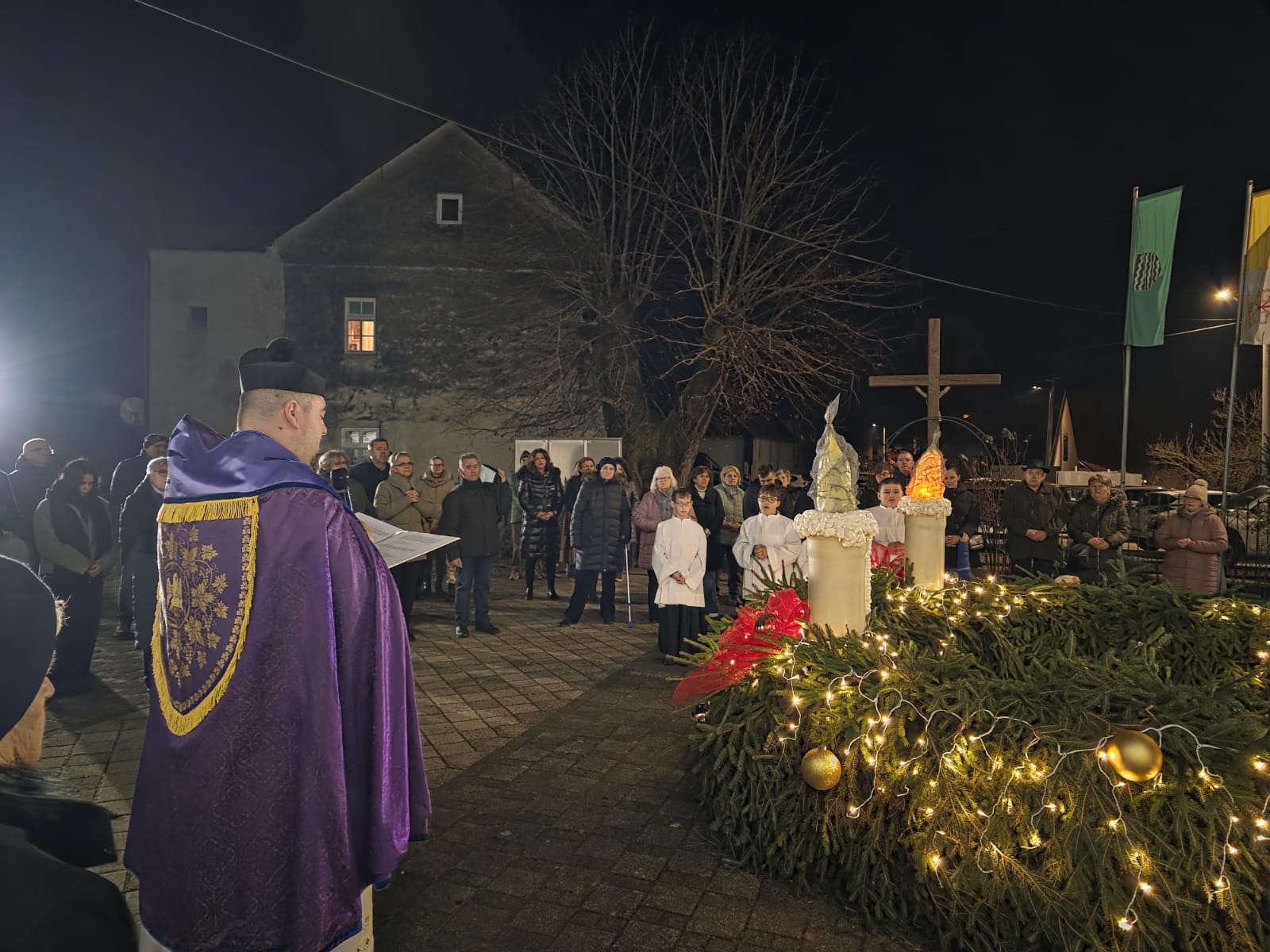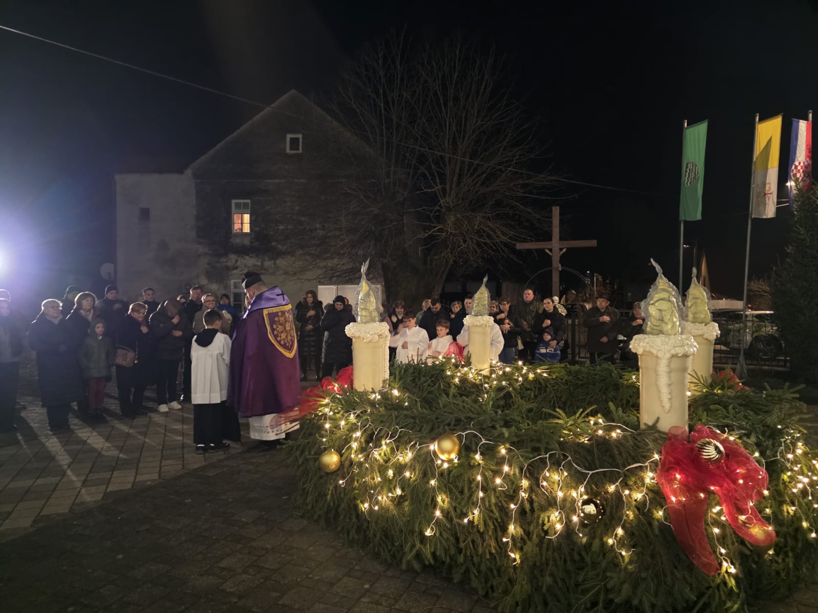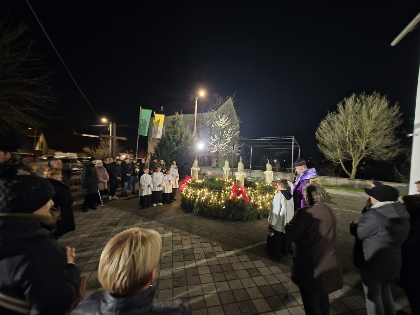 Sami župljani izradili su ovaj adventski vijenac koji je večeras i blagoslovljen, a onda se uz pjesmu i molitvu ušlo i u otajstvo ovogodišnjeg došašća, predvođeni župnikom vlč. Markom Nimcem.
